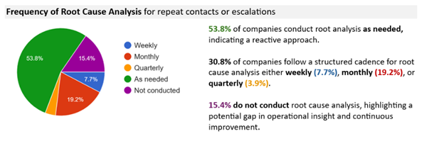 A strong majority (84.6%) of participating companies conduct root cause analysis for repeat contacts or escalations in some form. Most (53.8%) do so as needed, reflecting a reactive approach, while 30.8% follow a structured cadence (weekly, monthly, or quarterly).
